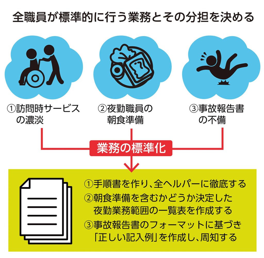 先ほどの例でいうと、訪問時に行うべきことを簡単な手順書にし、全ヘルパーがその通りにすることを徹底すれば、サービスの濃淡は緩和される。 夜勤職員の朝食準備の件は、夜勤の業務範囲を一覧表にし、その中に朝食準備は含まれるのか含まれないのかを決めればいい。