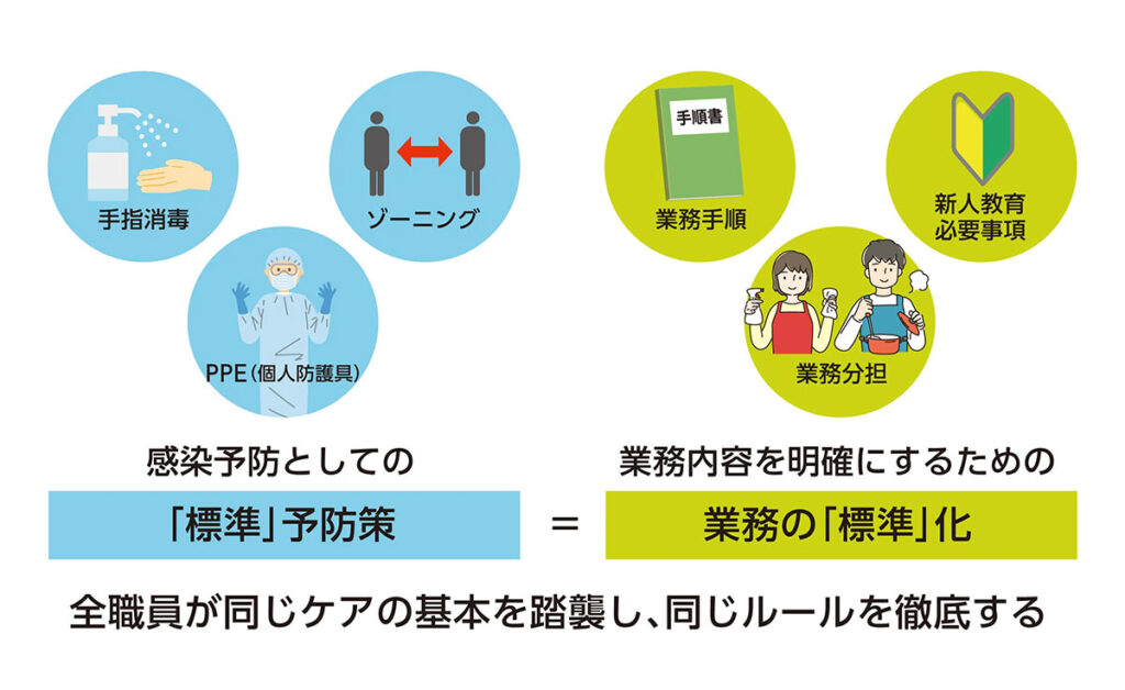 感染予防は、たとえひとりでも定められた対策を怠れば効果が薄れてしまう。だから、全職員が手指消毒の手順を統一してウイルスや細菌の侵入を防ぎ、利用者の中に感染者が発生した際にはゾーニングやPPE(個人防護具)の脱着ルールを徹底する。