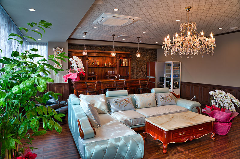 ソファ・テーブル・テレビ・BDプレイヤー・バーカウンター(水道・シンク)・製氷機・電子レンジ・エアコン |