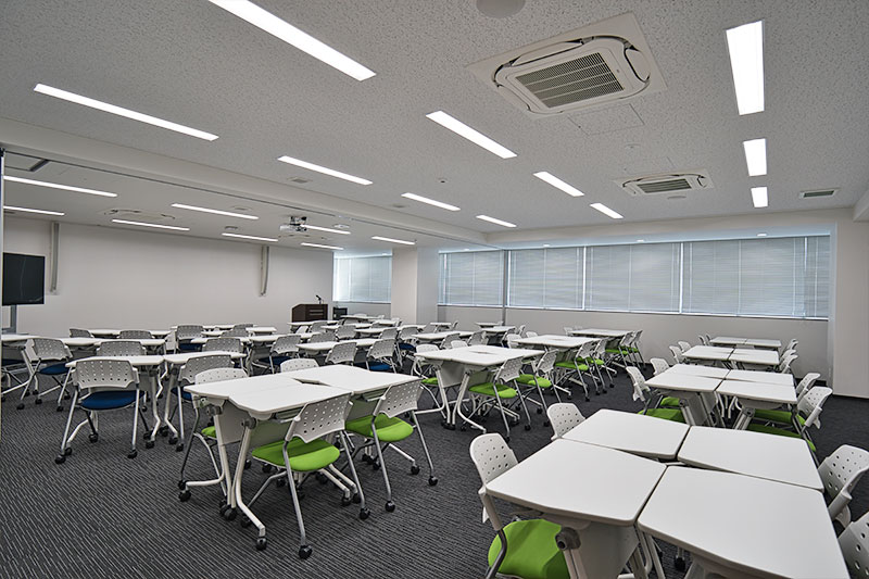 講演台・マイク(有線1本・無線2本)・BDプレーヤー・プロジェクター(天井固定/映像はBDプレイヤーまたはHDMIケーブルより入力可能)・TV(モニターとして利用)・机/椅子(65セット)・会議用長テーブル(6脚)・ホワイトボード ※机のレイアウトは自由に変更できます。 ※Bタイプ・Cタイプは利用できる設備が異なります。プロジェクターはCタイプ側のみ、BタイプはTVモニタでの対応となります。 |
