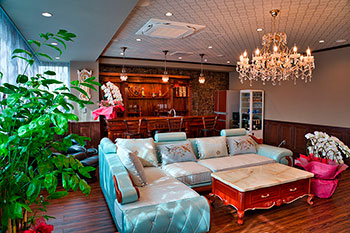 ソファ・テーブル・テレビ・BDプレイヤー・バーカウンター(水道・シンク)・製氷機・電子レンジ・エアコン |